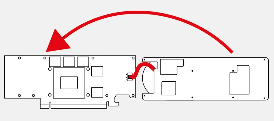 Lay the cooler upside down, with its fan against the rear of the card, and plug in the fan header. Then pivot the cooler into place on the card.